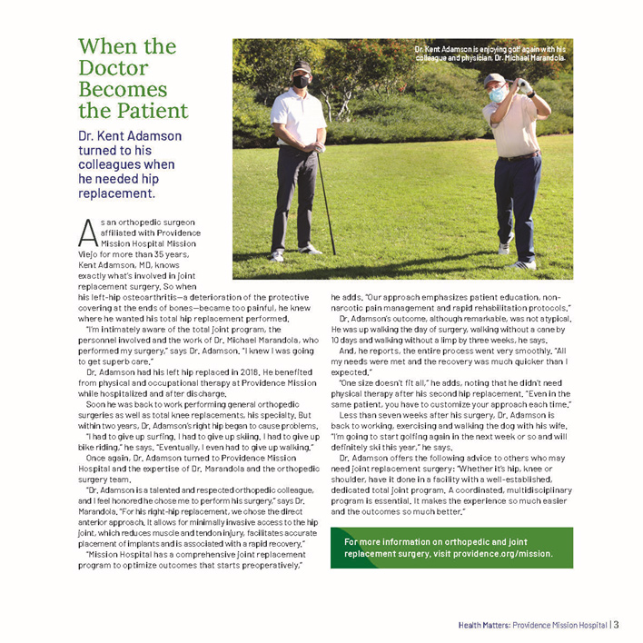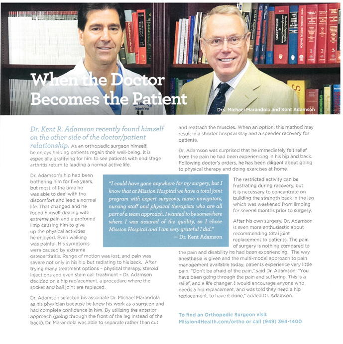 Dr. Marandola has served the South Orange County community by volunteering his time as team physician/orthopedist for Saddleback Valley Christian Schools, San Juan Hills High School, Aliso Niguel High School and Mission Viejo High School.
